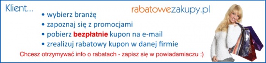 Rabatowe zakupy to atrakcyjne rabaty, zniżki, promocje, upusty, bonusy na zakupy i usługi w całej Polsce. Rabatowe zakupy to wyjątkowe oferty w niskich cenach z różnych branż, w tym także niedostępnych do tej pory w zakupach grupowych. Znajdziecie tutaj darmowe kupony na rabaty, promocje, upusty, oferty od firm z różnych branż i bogatym asortymentem. Dzięki rabatom, promocjom, upustom, bonusom, czy też ofertom specjalnym zamieszczanym przez firmy, możemy zaproponować bardzo atrakcyjne rabaty w formie darmowych kuponów rabatowych.